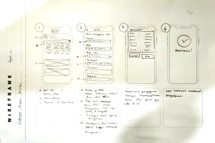 Now, let's talk about the first flow I sketched out: applying for leave. I consulted with the relevant division about the data that can be displayed. This will help me design efficient flows. For instance, when filling out the leave application form, users no longer have to manually enter their name and employee identification number. It's automatically filled in to speed up the form-filling process. This automation is possible thanks to the integration with the existing HR system in the company. So, the programmer only needs to create an API to retrieve the data.
